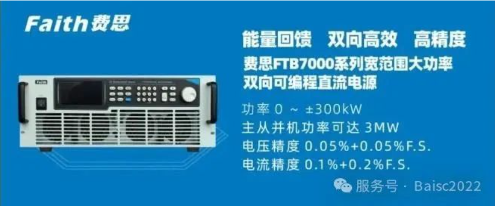 费思FTB7000核心性能宽范围输出:电压0~2250V,电流0~±2880A,功率覆盖0~±300kW,主从并机扩展功率可达3MW。高精度控制:电压精度0.05%+0.05%F.S.,电流精度0.1%+0.2%F.S.,功率因数0.99,整机效率高于93%。高效回馈:回馈式负载功能,回馈效率高达95%。产品亮点01回馈式负载功能FTB7000系列产品具备回馈式负载功能,可将被测设备的能量回馈至工