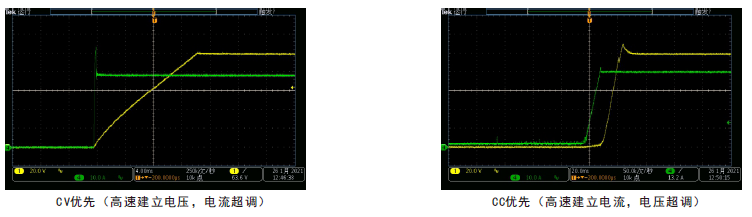 当电源输出接入感性或容性负载时会造成输出电流或电压一定程度的过冲,轻则触发被测设备保护,严重的将直接导致被测设备损坏。FTP系列具备CV、CC输出优先功能从而有效抑制输出过冲及带来的影响。