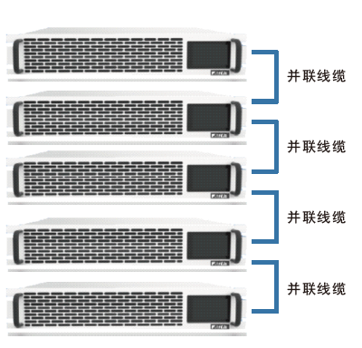 FTDM系列采用先进控制算法实现多机并联,并机系统功率等级可覆盖1MW,大大扩展了电源的应用输出范围。并机功能除了使电源之间自动均载,保持输出值的一致,还保证了输出斜率曲线或者波形的一致。处于并联状态的主机,电源屏幕显示的是总电压、电流和功率值。每路从机自主均流,自动求和。