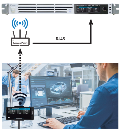 当使用者将62000E系列直流电源整合于自动测试系统内,透过GPIB界面进行程序控制,使用者不需前往实验室现场察看机器前面板读值及状态,可轻松透过LAN界面执行远端镜面投射功能了解电源目前的输出及状态。