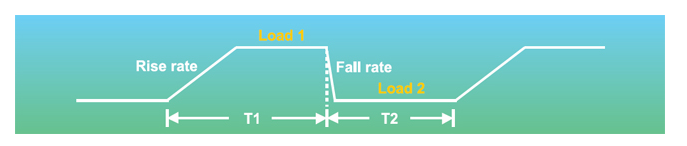 在快速的时代里,电子元件皆朝高速运作的方向设计,因此,电源元件对于暂态的信号及动态响应的性能要求,比过去都高出许多。为满足这些 测试应用与要求,63200系列提供高速、可编程动态负载模拟与同步动态负载等功能。下图所示为可编程的参数:设定电流高/低准位、T1/T2、爬 升率/下降率。可编程的电流爬升率/下降率可用来模拟真实负载情况的暂态负载变化模拟。63200系列中,在负载电流连续变化时,内部的监测机 制与线路能使得电流波形失真度达到小化,电流爬升率快可达25A/μs (63208)、动态变化可高达20kHz。