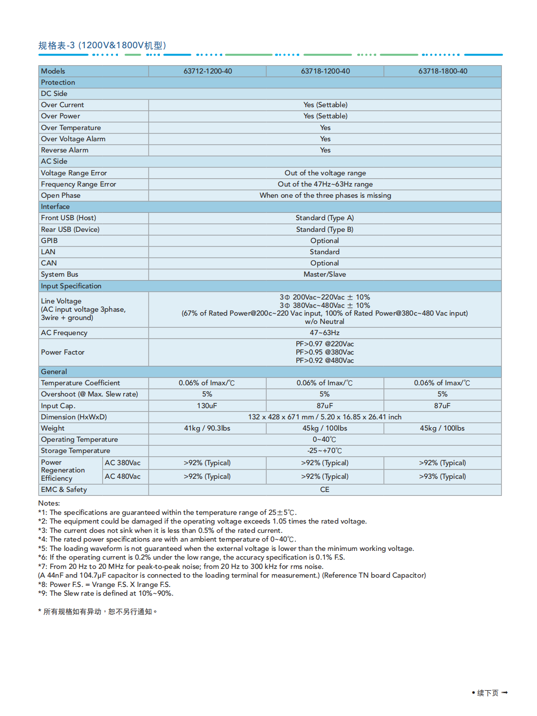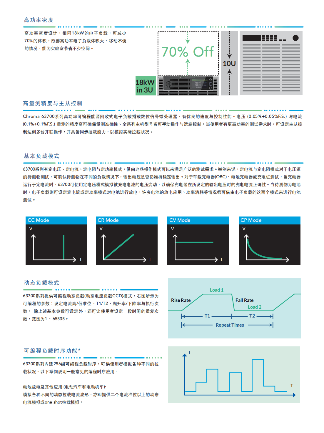 63700系列能源回收式直流电子负载,适用于电动车电池放电、燃料电池放电、大功率电源老化、直流充电桩、单向车载充电器可靠性、燃料电池发动机系统、储能系统、AC/DC与DC/DC电源供应器、功率电子元件及电力电子元件等产品信赖性测试使用。