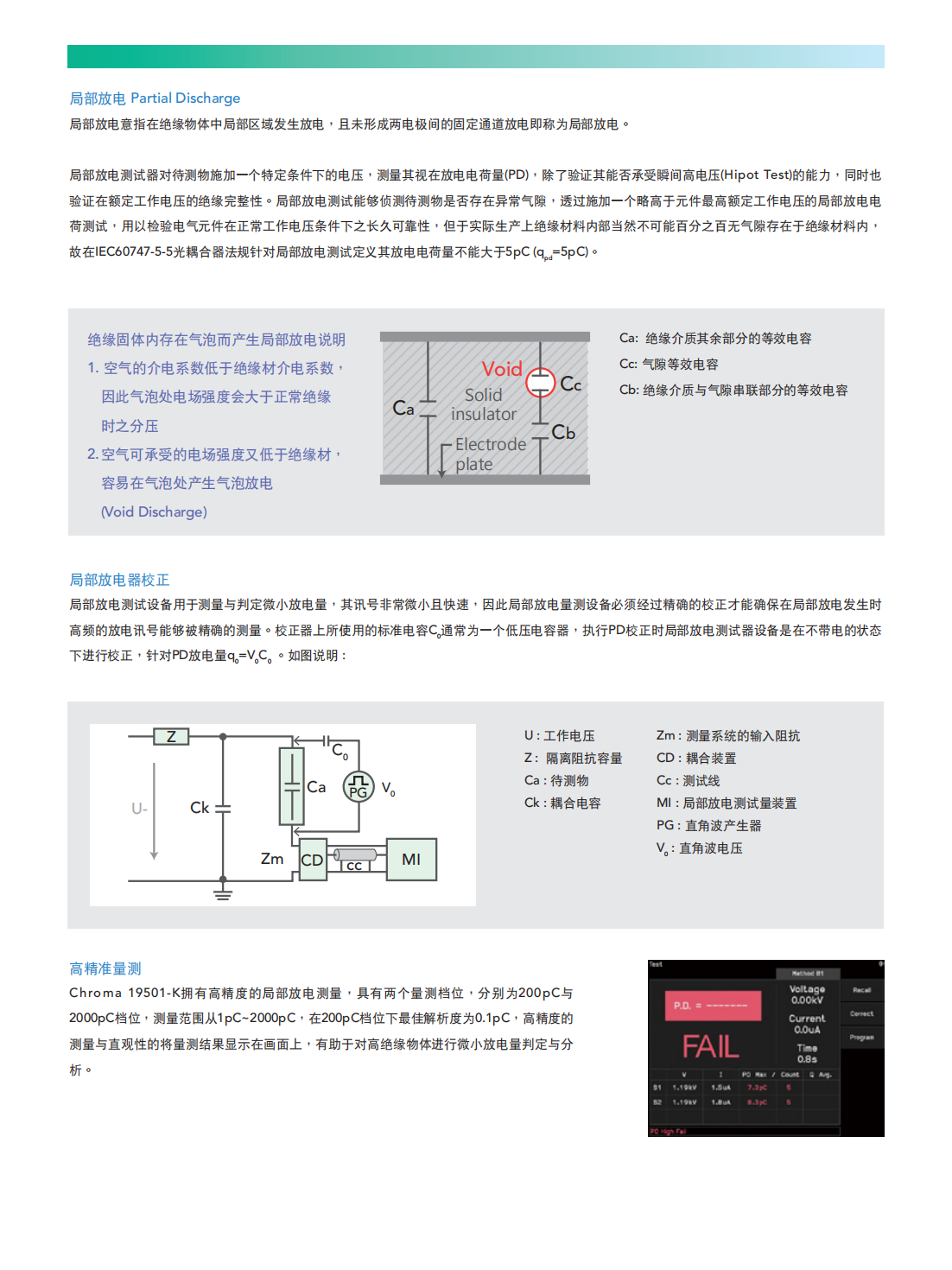 Chroma 19501-K局部放电测试器内建交流耐电压测试(Hipot Test)与局部放电(PartialDischarge,PD)侦测功能于一单机,提供交流电压输出0.1kV~10kV,漏电流测量范围0.01μA~300μA,局部放电侦测范围1pC~2000pC,针对高压半导体元件与高绝缘材料测试应用所设计与开发。